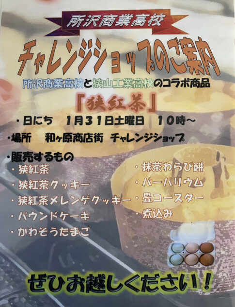 イベントトコロードチャレンジショップにて、所沢商業高校と狭山工業高校のコラボ商品の販売と、所沢商業高校と和ヶ原商店街のお店とのコラボ商品の販売を行います。 2026年1月31日(土)10:00〜