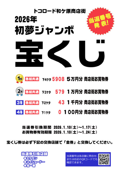 初夢ジャンボ宝くじの当選番号が発表されました! 1等 各組共通 下4ケタ 5908 2等 各組共通 下3ケタ 579 3等 各組共通 下2ケタ 43 4等 各組共通 下1ケタ 0 当選券引換期間 2026.1.10(土)...